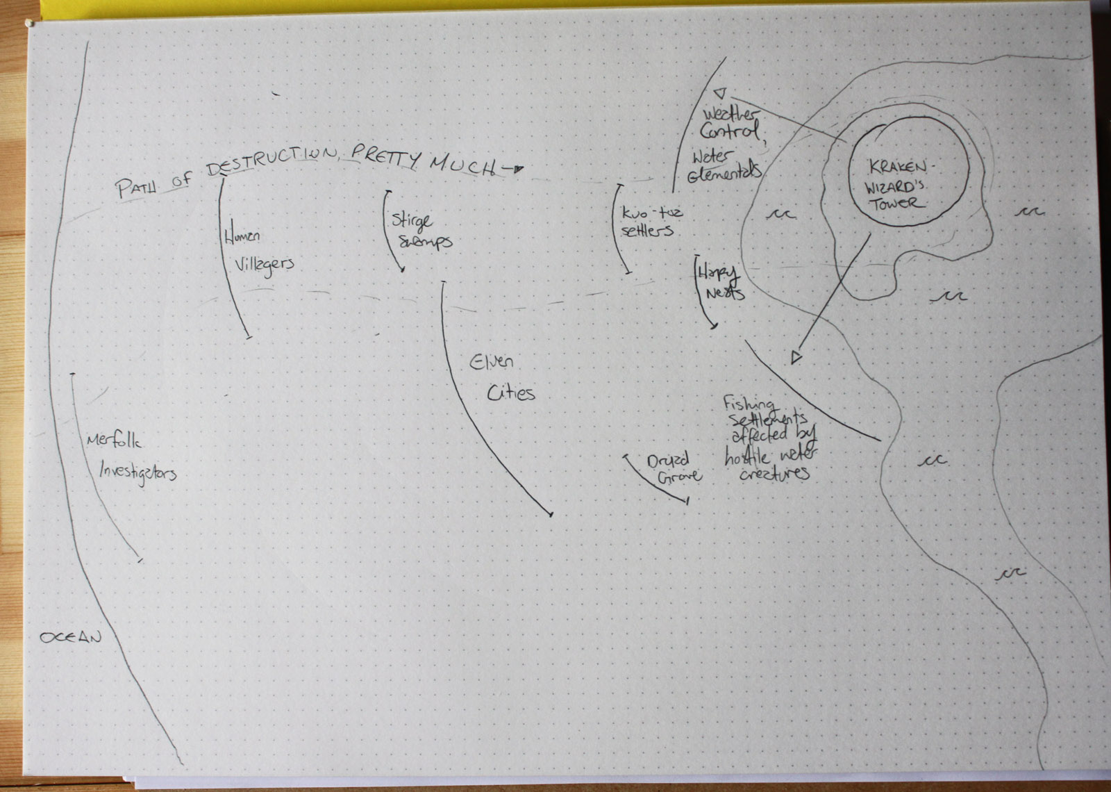 The kraken was the monster I had the most fun reading. It’s a meanie in the new Monster Manual, and unlike what you might be used to about a sea monster, this one has the ability to breathe air and travel over land (while destroying everything in its path). So I decided to map out a kraken’s recent interest in a magic tower, and the repercussions that come out of that.