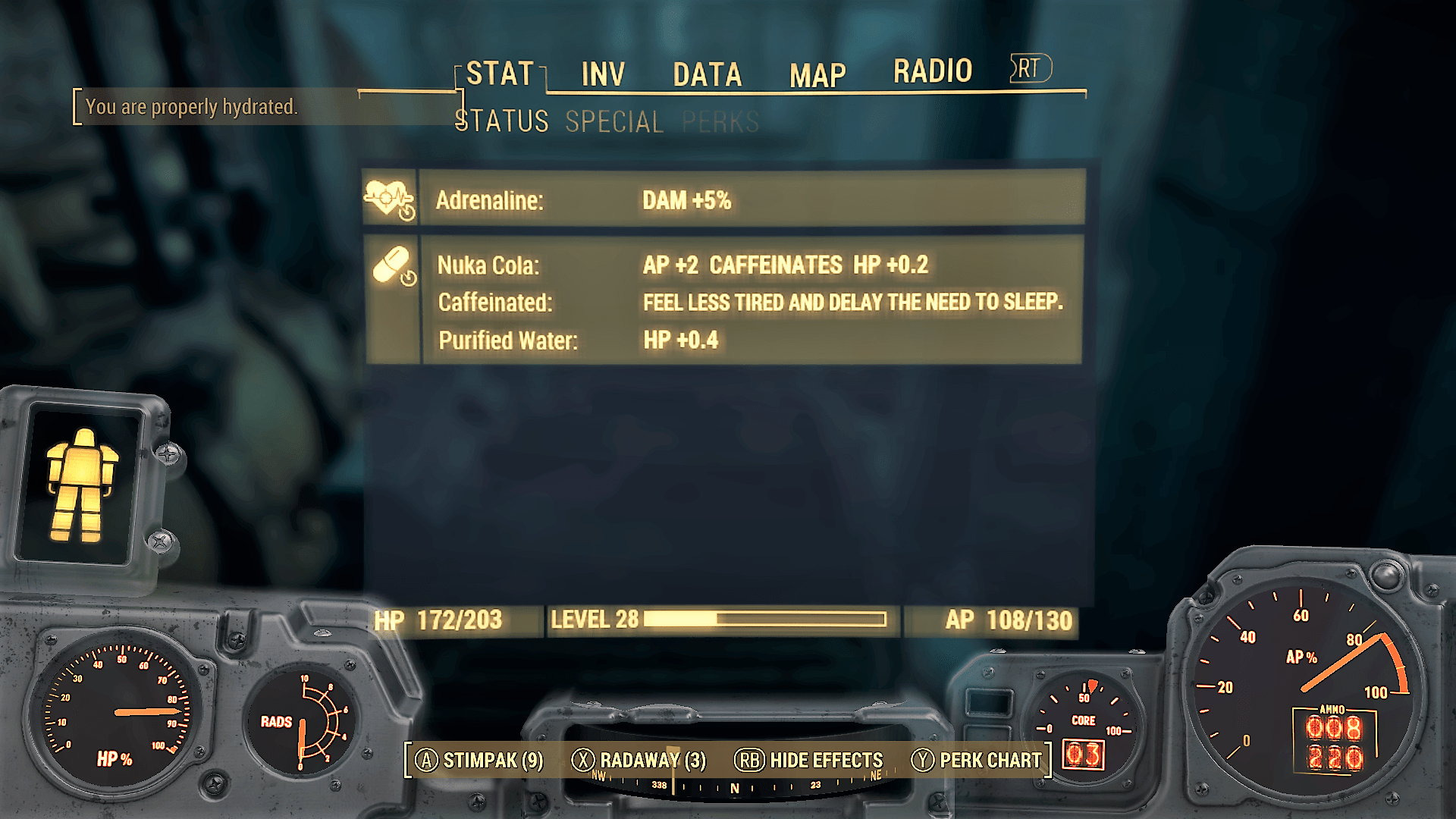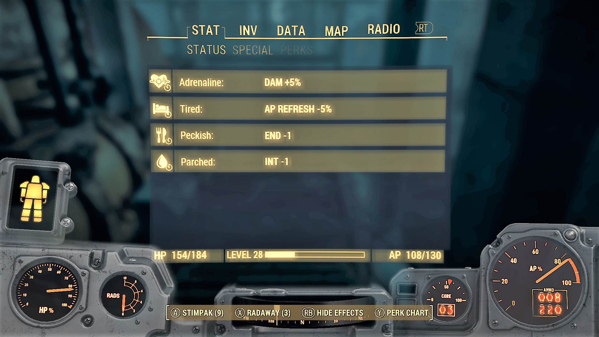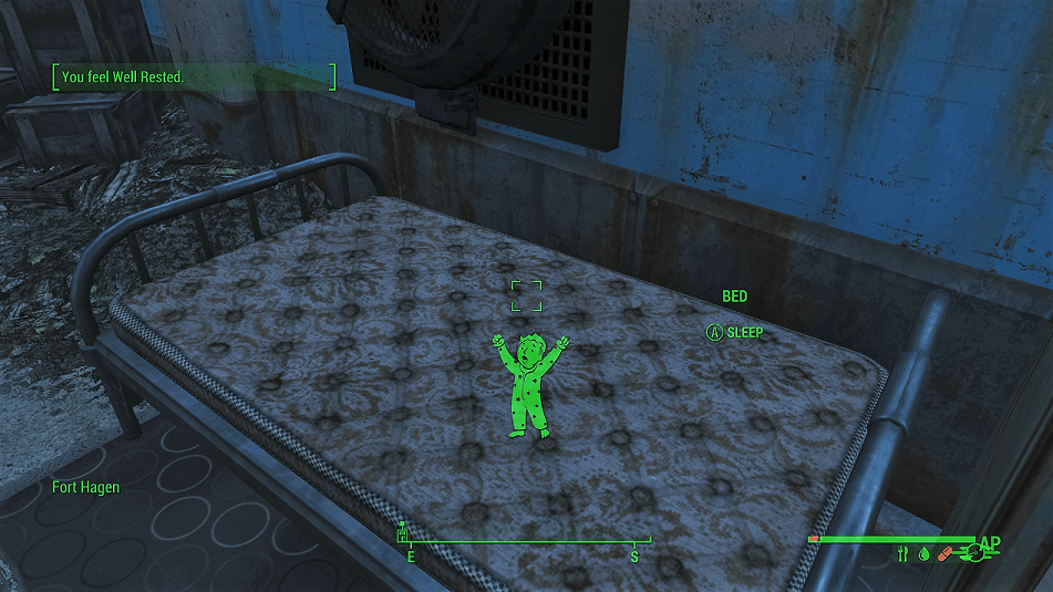 1) Being tired, hungry, thirsty, or sick affects you in differing ways. Sometimes your SPECIAL stats lower, and sometimes you have fewer Action Points in the way you have fewer HP while suffering from radiation. A few maladies, such as infection, cause damage over time. All this works to create a cool experience, failing only with the over-encumbered damage. If I’m carrying too much, maybe I just can’t move? Perhaps, like with companions, the game just tells me, “Sorry, you can’t carry anymore.”